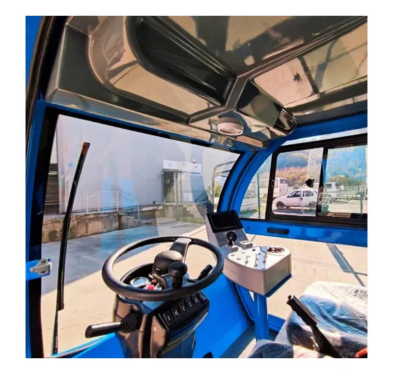 • Konforlu Kabin: Kapalı Kabin, hidrolik direksiyon, ergonomik, deri kaplı şoför koltuğu ve emniyet kemerleri ile uzun çalışma saatlerinde konfor ve güvenlik sunar. Opsiyonel Klima ile kabin konforu artırılabilir.