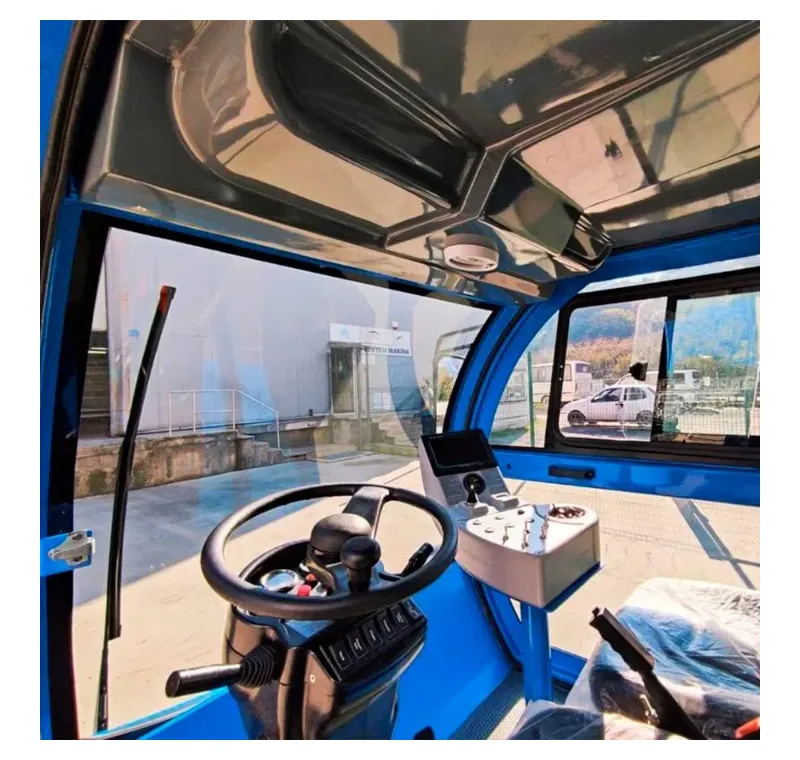 • Konforlu Kabin: Kaynaklı çelik konstrüksiyonlu kabin, ergonomik, deri kaplı şoför koltuğu ve emniyet kemerleri ile uzun çalışma saatlerinde maksimum konfor. Opsiyonel Klima seçeneği mevcuttur.