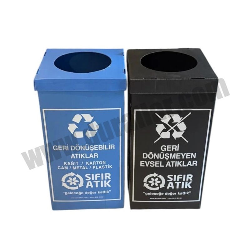 Malzeme: Çöp kutuları Polipropilen (PP) oluklu levhadan imal edilmektedir. Bu malzeme hafif, suya dayanıklı ve uzun ömürlüdür.