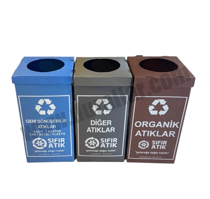 3 lü Sıfır Atık Kutuları, Sıfır Atık Projesi renk skalasına ve resmî atık isimlerine uygun olarak üretilmiştir.